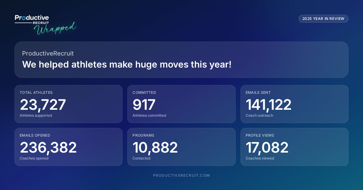 2025 was an amazing year for ProductiveRecruit athletes! See how 23,727 athletes connected with college coaches, sent 141,122 emails, and achieved 917 commitments.
